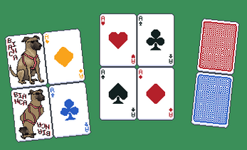This pack includes all 52 playing cards, unique face cards, two jokers (ft. Bianca, my cool dog), two card backs, an empty card and a card shadow.